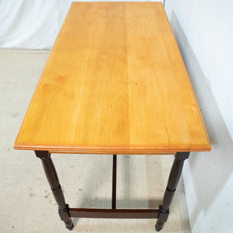 Fluted top edges, 3 drawers to the left side with imbuia knob handles, the desk is reinforced with a stretcher and ends on turned legs.