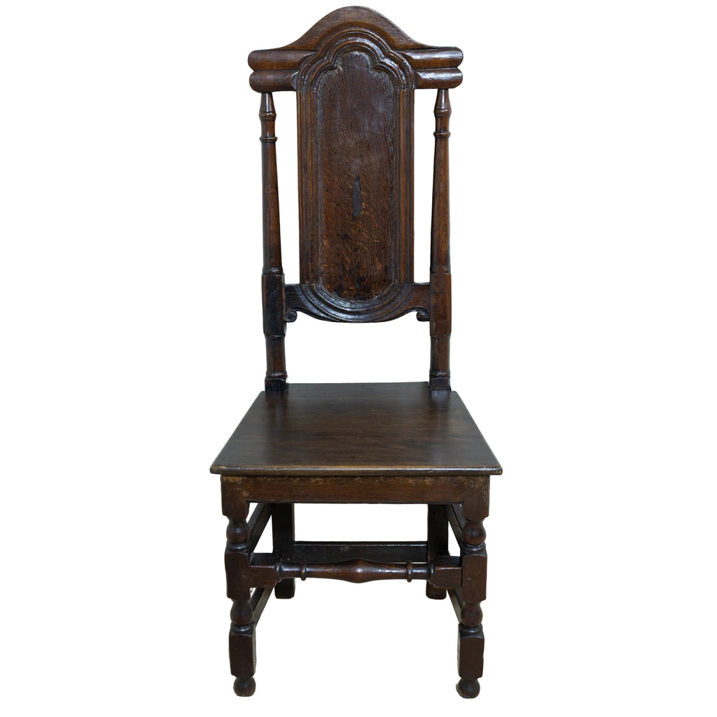 Dome shaped top rail with a paneled back slat and 2 round turned stiles. Wooden seat and baluster turned legs with an H-stertcher reinforcement design.