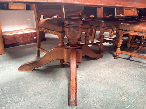 Straight edged top with one extension (590 mm), ends on two tripod legged bases with splayed legs.