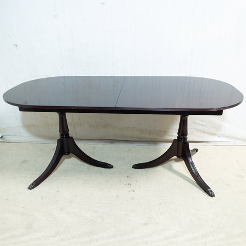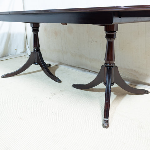 Fluted top edges, twin pedestal bottom with round tapered columns and splayed legs terminating on brass feet. Extens from a 6-seater to an 8-seater. Manufactured by Duros.