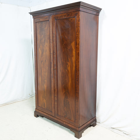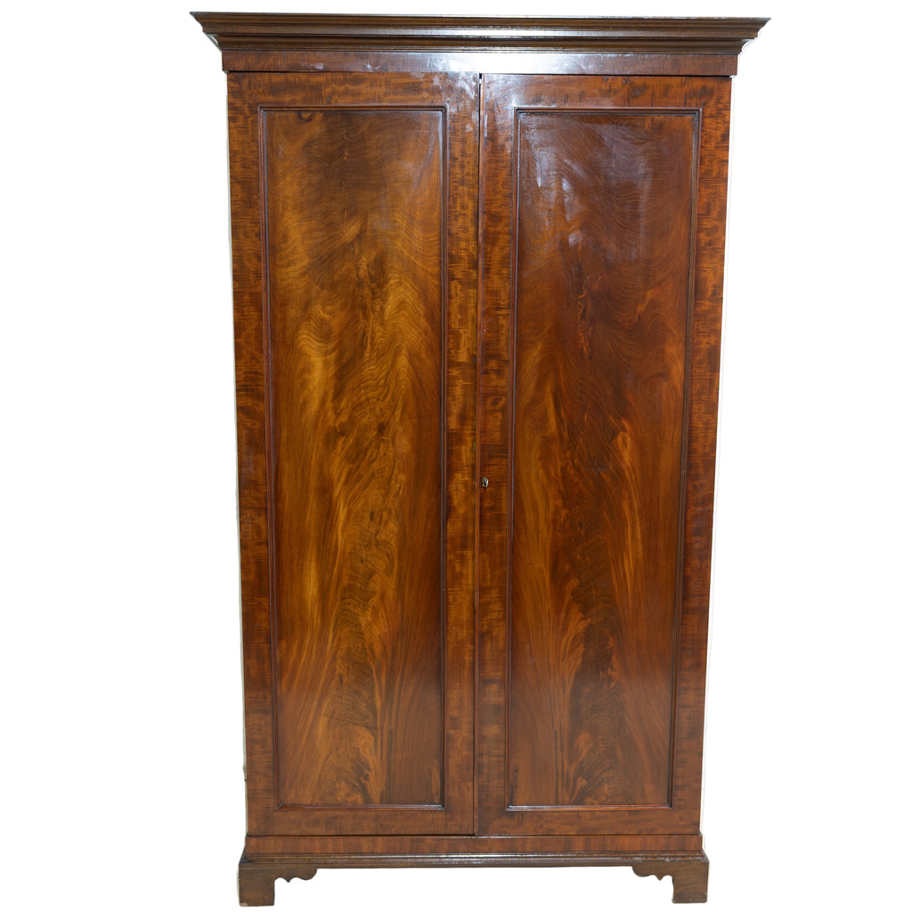 Beautiful flame mahogany grain pattern to the 2 front paneled doors, hanging rack and hooks to the inside section with 3 drawers below. Original locks and fittings. Ends on bracket feet.