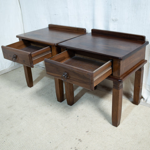 Rounded top edges, 1 drawer to aprons with ring handles and ends on square legs that taper to the bottom.