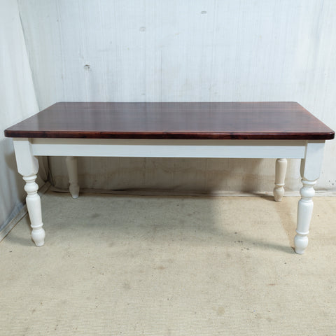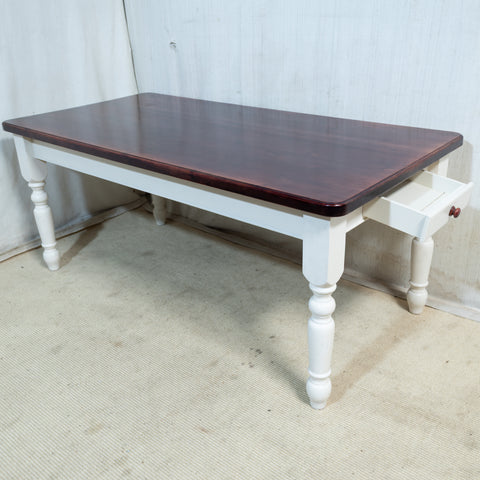 Thick pine top with 1 small drawer to the apron. Ends on white painted baluster turned legs.