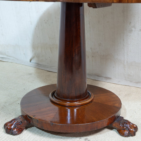 Thumb moulded top edge with round tapered column below, round base with 3 hand carved lion paw feet.