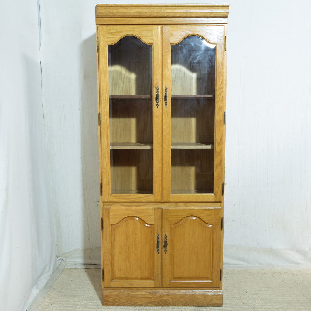Moulded top cornice, beveled glass paneled front doors, 2 adjustable shelves inside the top section and one below. The bottom section consists of 2 solid raised paneled doors.