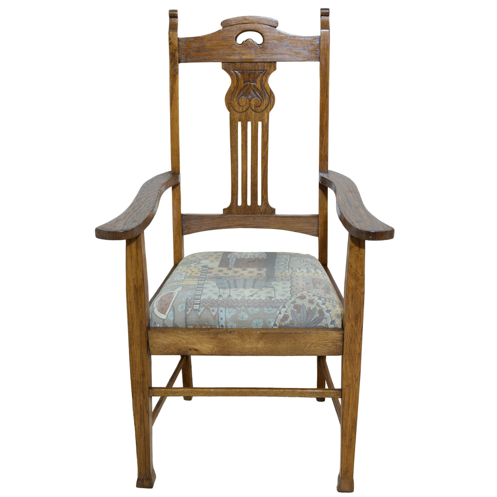 Carved 3 slatted back slat, scroll tops, curved arm rests, drop in upholstered seat, and ends on tapered legs.