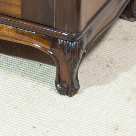Hand carved floral and foliate motfis, gadrooned top edge with 5 drawers below, flanked by 4 solid raised paneled doors. 4 Loose shelves inside. Ends on attractively carved feet.