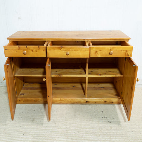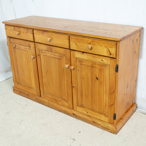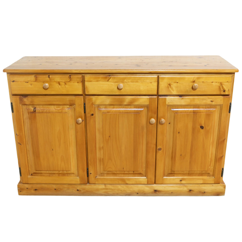 Routed top edge, 3 drawers and solid raised cupboard doors. Fixed sehlves and ends on a plinth base.